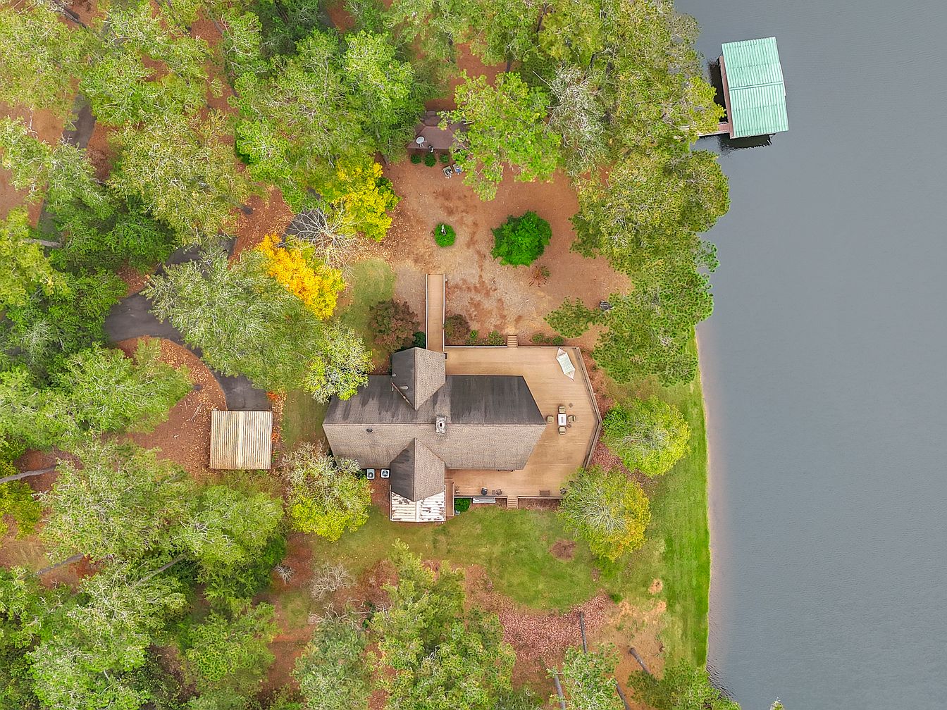 A spacious lakeside backyard is seen from above, featuring a home surrounded by mature trees and lush greenery for added privacy and shade. An expansive deck wraps around the rear of the house, ideal for outdoor family gatherings or relaxing while enjoying nature. The yard seamlessly meets the gentle shoreline of a lake, offering direct water access and ample room for play. A dock extends over the water, perfect for boating or fishing. The color palette includes soft earth tones, vibrant greens, and sparkling blue, creating a serene and inviting atmosphere for children and adults alike.