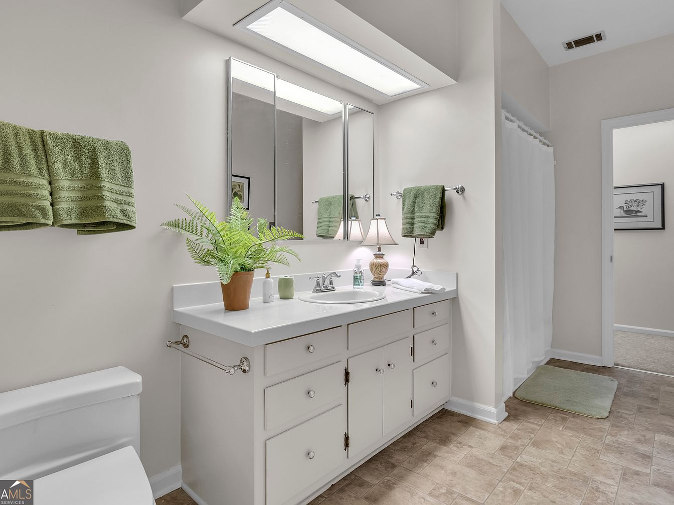 This spacious bathroom features a wide, white vanity with ample counter space and multiple storage drawers, perfect for organizing essentials for a family. Double mirrors and bright overhead lighting create a fresh, inviting atmosphere, while touches of greenery from a potted fern add natural charm. The neutral, soft beige walls blend harmoniously with the light tile flooring. Two green towels hang neatly from chrome towel racks, echoing the soothing botanical theme. A classic lamp and simple soap dispenser rest on the counter, while a curtained shower area in the background ensures privacy. The layout is open, practical, and easy to maintain.
