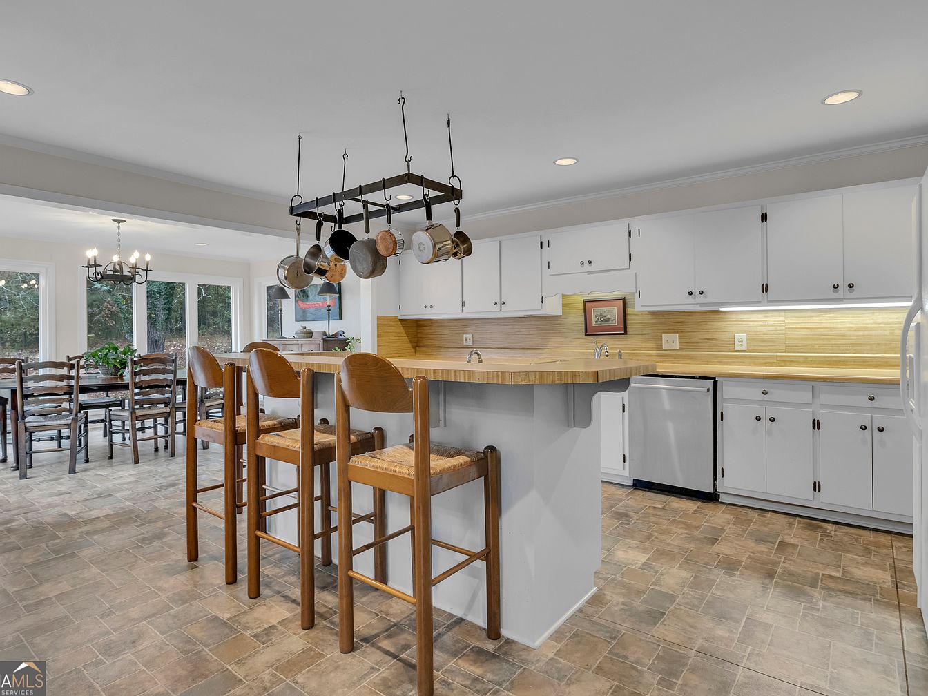 A spacious open-plan kitchen with a warm and inviting atmosphere, featuring a long wooden breakfast bar with three tall, sturdy chairs for casual family meals or homework time. Above the island hangs a charming black metal pot rack stocked with pots and pans for easy access. White cabinetry with sleek handles provides ample storage along both walls, complemented by a light wood backsplash and countertops that enhance the brightness of the space. The attached dining area accommodates a large family table under a traditional chandelier, surrounded by floor-to-ceiling windows that fill the area with natural light and offer views of the backyard.