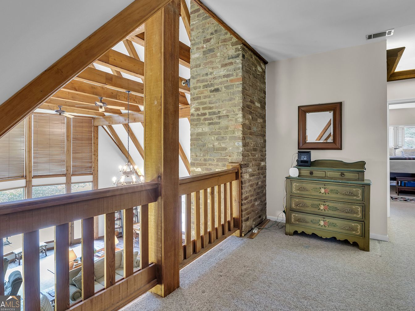A spacious loft landing overlooks the main living area with high, angled ceilings and exposed wooden beams, creating an open and airy atmosphere. The natural wood of the railings and beams pairs with a rustic brick feature wall, adding warmth and character. A green, hand-painted wooden dresser sits against a neutral wall, topped with a square framed mirror and practical tech gadgets, blending classic and modern touches. Plush carpeting ensures comfort and safety for all ages, while nearby large windows fill the area with soft natural light, making this an inviting and family-friendly transition space between rooms.