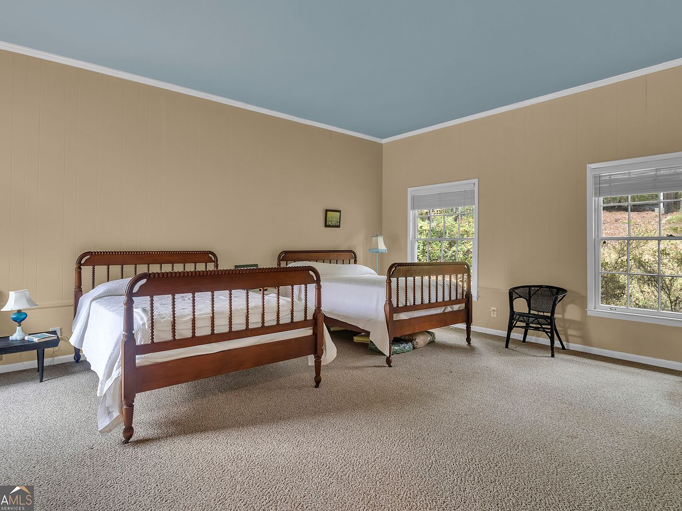 This large, inviting bedroom features two vintage wooden beds topped with crisp white linens, perfect for siblings or guests, catering well to families. The light beige walls are accented by a sky-blue ceiling, creating a calming, airy atmosphere. Large corner windows fill the room with soft natural light and offer bright views of the outdoors, while sturdy light carpeting provides warmth and safety for children. A small bedside table with a blue lamp and a black wicker chair add practical touches. The simple, uncluttered layout allows ample space for children to play or further personalize the room, making it both functional and welcoming.