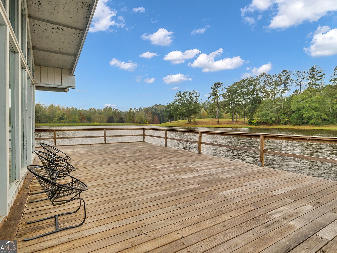 A spacious wooden deck extends from the home, offering stunning panoramic views of a tranquil lake and nearby green spaces lined with mature trees. The deck’s sturdy railing ensures safety, making it ideal for families with children. Three modern black metal chairs are positioned along the side, providing a perfect spot for relaxation or enjoying family activities outdoors. The deck is constructed with natural wood planks that give a warm, rustic charm, while the exterior of the house features large glass windows that invite in natural light. The open layout creates a perfect environment for gatherings and outdoor living.