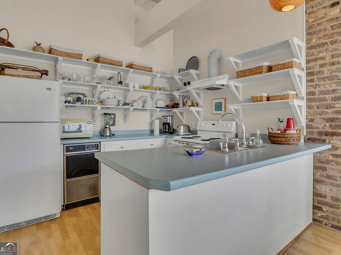 A spacious kitchen with light wood flooring features a large, practical countertop perfect for meal prep and family gatherings. Open white shelving lines the walls, displaying neatly organized dishware, glassware, and woven baskets for added storage convenience and accessibility. The color palette is fresh and airy, with soft blue countertop surfaces complementing white cabinetry below. Appliances such as a refrigerator, microwave, dishwasher, and coffee maker are easily accessible, making this kitchen ideal for a busy family. Warm brick accents add character, while overhead lighting and natural light keep the space welcoming and family-friendly.