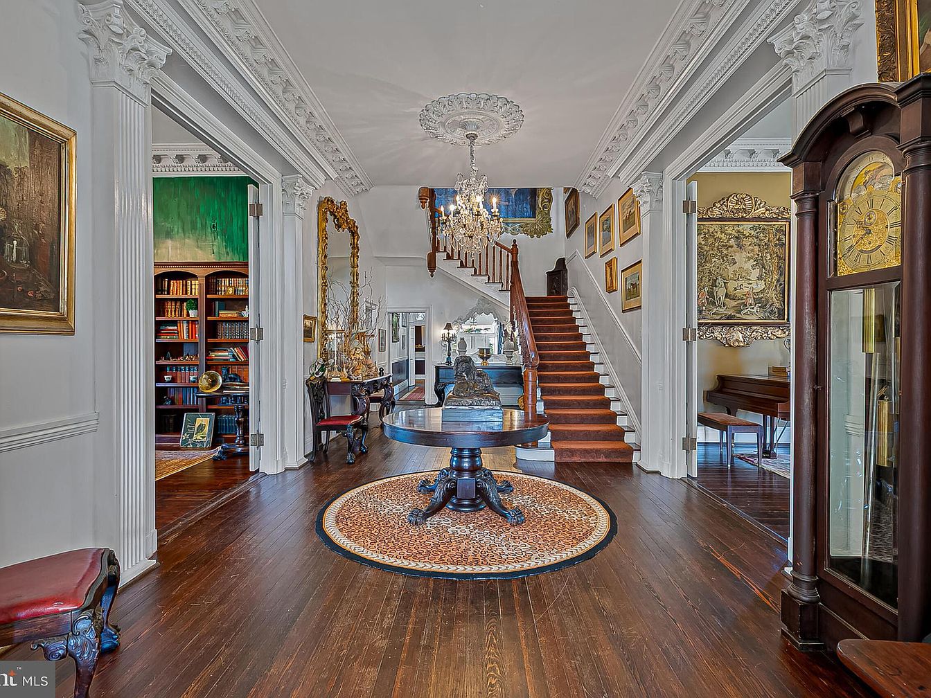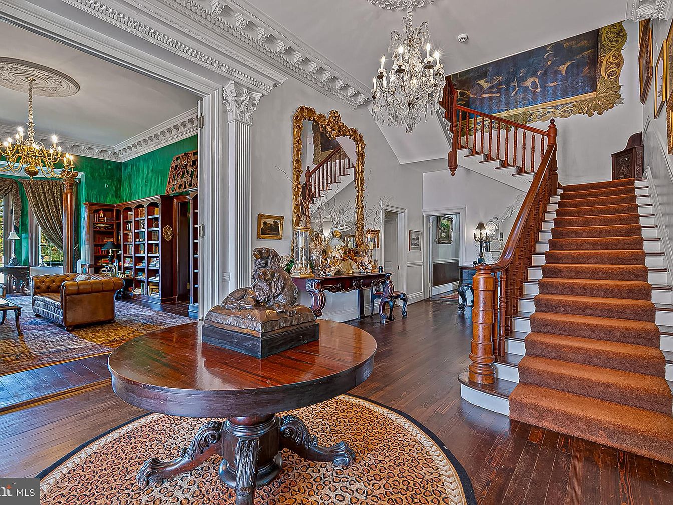 The inviting entryway features intricate white moldings and a stunning chandelier that casts a warm glow throughout the space. Rich wooden floors provide a beautiful contrast to the bright walls, enhancing the home’s classic charm. A grand staircase, adorned with a plush runner, leads to the upper levels, while an assortment of framed artworks adorn the walls, adding an artistic touch. A circular table at the center is complemented by an elegant area rug, creating a perfect spot for family gatherings. This area is designed to welcome guests while offering a glimpse into the tasteful and family-friendly nature of the home.