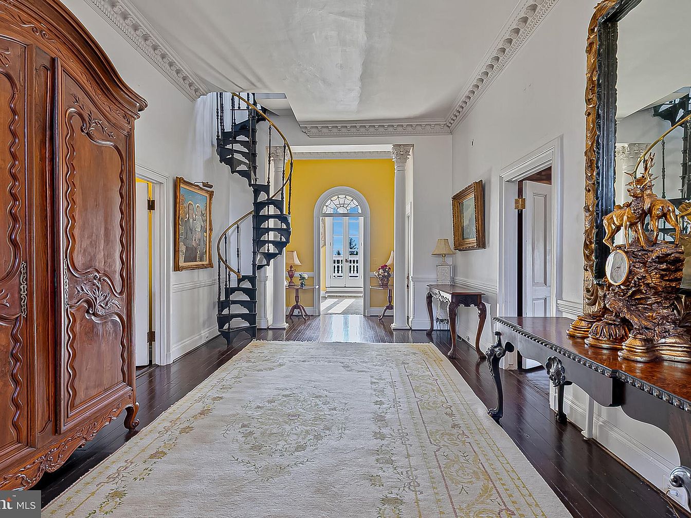 This elegant entryway features a striking spiral staircase that draws the eye upward, enhancing the sense of space. The rich, dark hardwood flooring contrasts beautifully with the soft, light-colored walls adorned with intricate crown molding. A large wooden armoire adds character and storage, while decorative art pieces create visual interest. A bright yellow accent wall bathed in natural light from the arched window offers a cheerful focal point. Family-friendly elements include ample room for welcoming guests and a plush area rug that defines the space, making it both inviting and functional for everyday use.