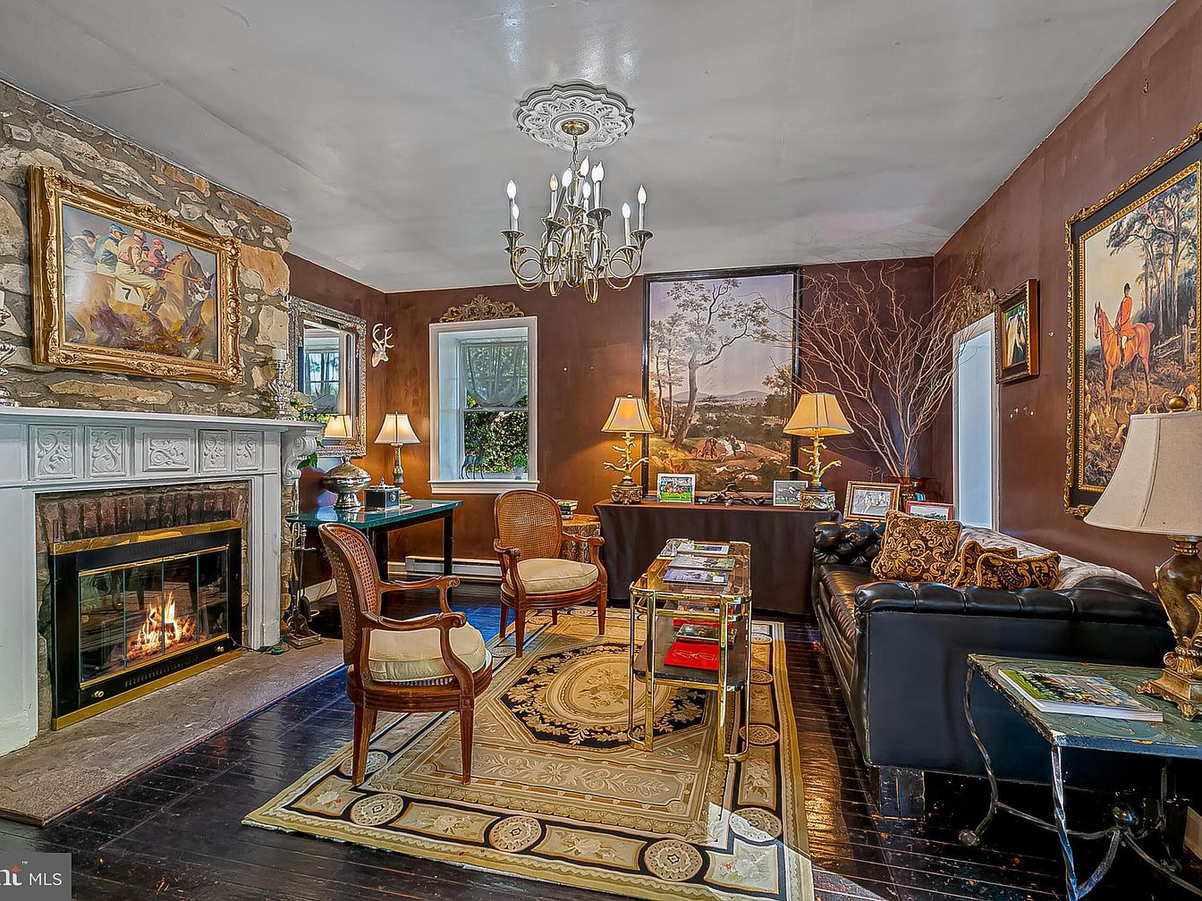 This inviting living room features a cozy, stone fireplace framed by elegant white trim, making it a perfect spot for family gatherings. The rich brown walls enhance the warmth of the space, complemented by tasteful artwork depicting pastoral scenes. A classic chandelier hangs gracefully from the ceiling, providing soft illumination. Comfortable seating includes a plush black leather sofa adorned with decorative pillows, paired with two vintage-style chairs that invite conversation. A patterned area rug beneath a glass table adds a touch of sophistication, while well-placed lamps create a welcoming ambience, ensuring this room is ideal for family moments.