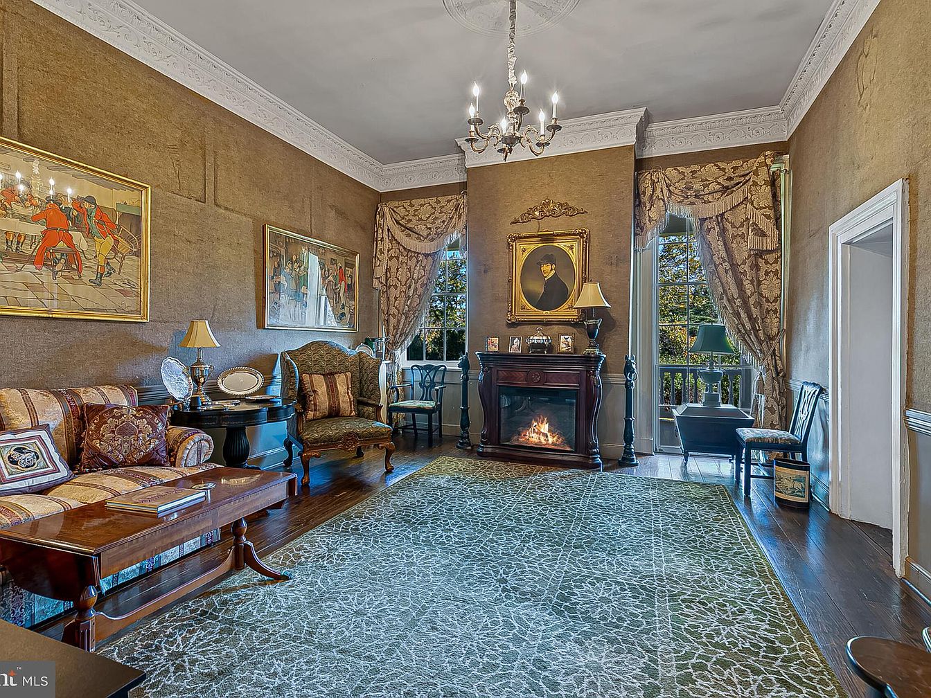 This elegantly designed living room features rich, textured walls and classic architectural details like crown molding. A cozy seating arrangement includes a plush sofa adorned in warm, patterned fabric, complemented by an intricately designed armchair. A beautiful area rug adds warmth, perfectly balancing the room. The space is enhanced by tasteful artwork, framed elegantly on the walls, showcasing fine moments of history. Natural light floods in through large windows, adorned with ornate curtains, creating a cheerful ambiance. The fireplace adds a charming focal point, ideal for family gatherings, making this space welcoming and perfect for relaxation.