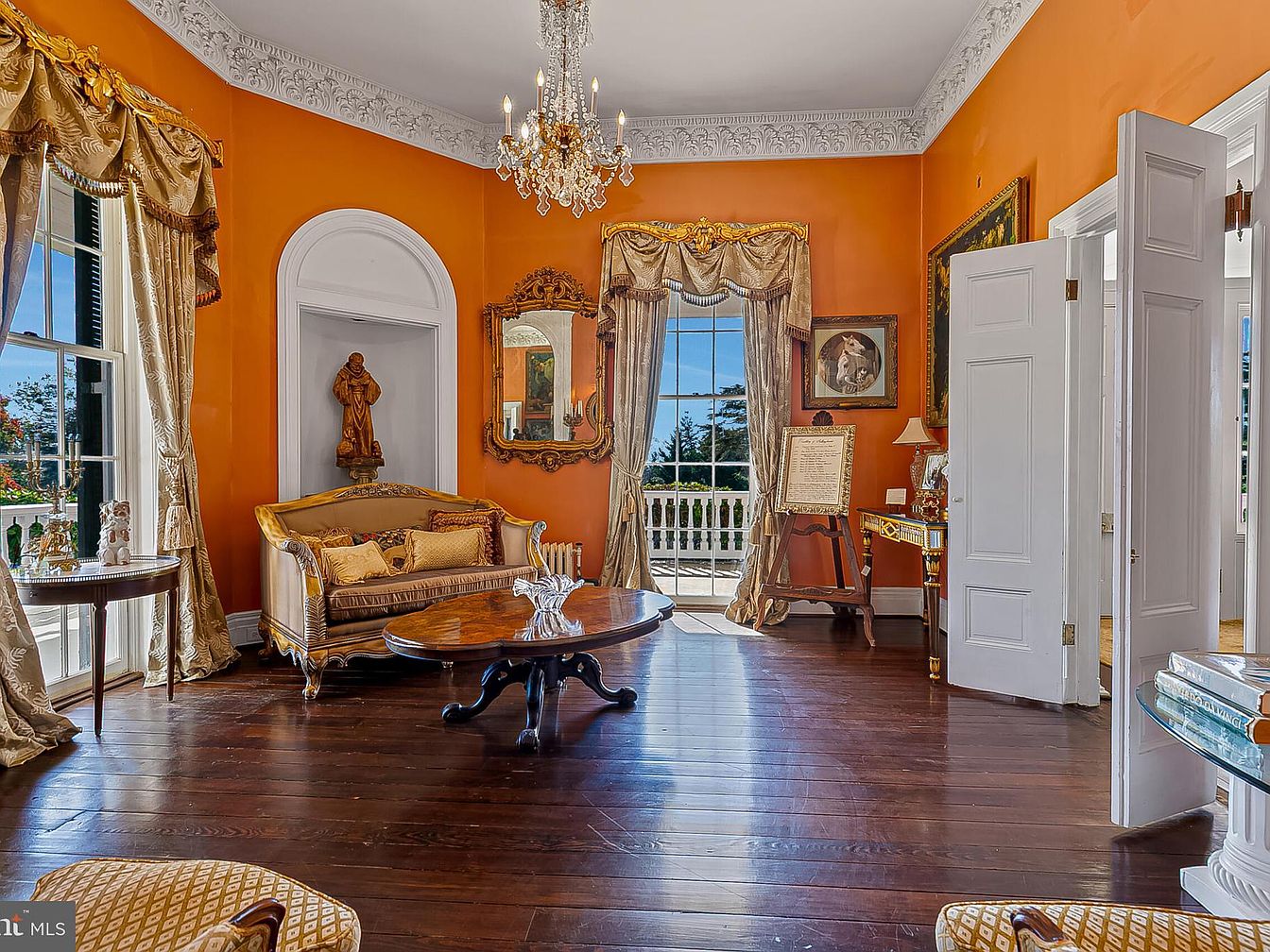 This vibrant living room features an elegant orange accent wall, creating a warm and inviting atmosphere. Rich hardwood flooring complements the classic design, while intricate crown molding adds architectural charm. A plush, golden velvet sofa adorned with decorative pillows sits invitingly, paired with a round wooden coffee table. Natural light floods the room through large windows, highlighting tasteful decorative elements, including a vintage mirror and wall art. Draped with luxurious curtains, the space offers ample seating for family gatherings. An ornate chandelier hangs from the ceiling, enhancing the room’s sophistication and family-friendly appeal.