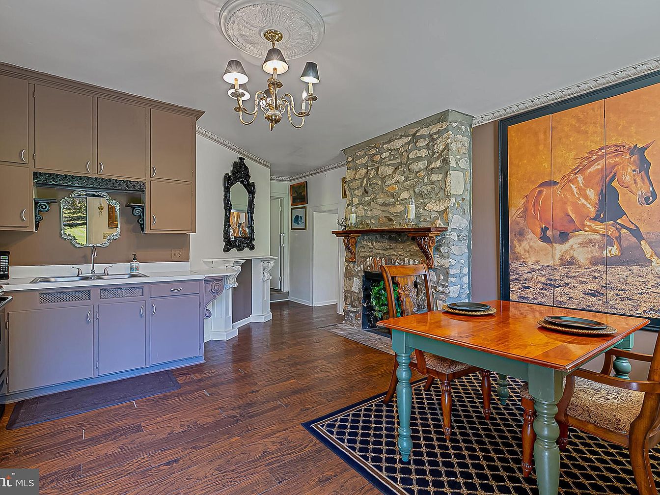This cozy dining area blends rustic charm with modern functionality, perfect for family gatherings. The room features warm hardwood flooring that invites comfort, complemented by a solid wooden table with teal legs, offering an engaging contrast against the rich tones of the floor. The backdrop showcases a striking stone fireplace, adding both warmth and character, while an artistic horse mural enhances the space’s uniqueness. Light spills in through a well-placed window, accentuated by a classic chandelier overhead. The cabinetry, finished in soft taupe, provides ample storage, ensuring a tidy yet inviting space for family meals.