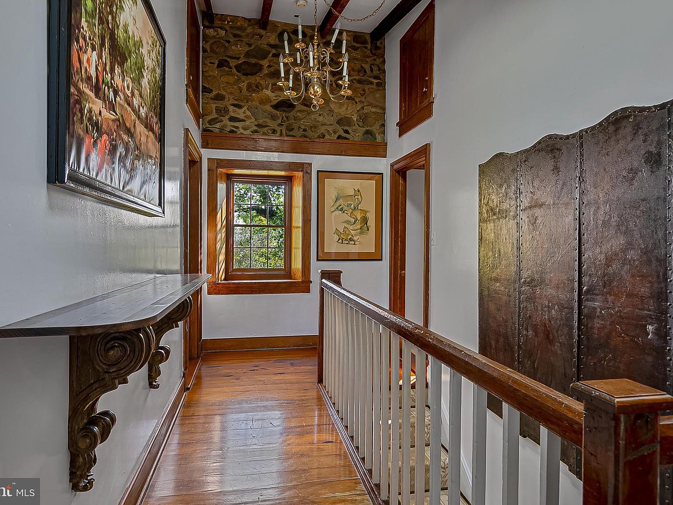 This inviting hallway features a blend of rustic charm and modern design. The polished wooden floor enhances the warm atmosphere, while the stone wall adds a unique texture. Classic wooden trim accents the windows and doors, framing views of the outdoors. On one side, a sleek wall shelf is adorned with decorative elements, complemented by artwork that infuses character into the space. The chandelier above illuminates the area with soft lighting, creating a welcoming ambiance. This family-friendly hallway serves as a beautiful transitional space, encouraging connection between the rooms it links and making it ideal for gatherings.