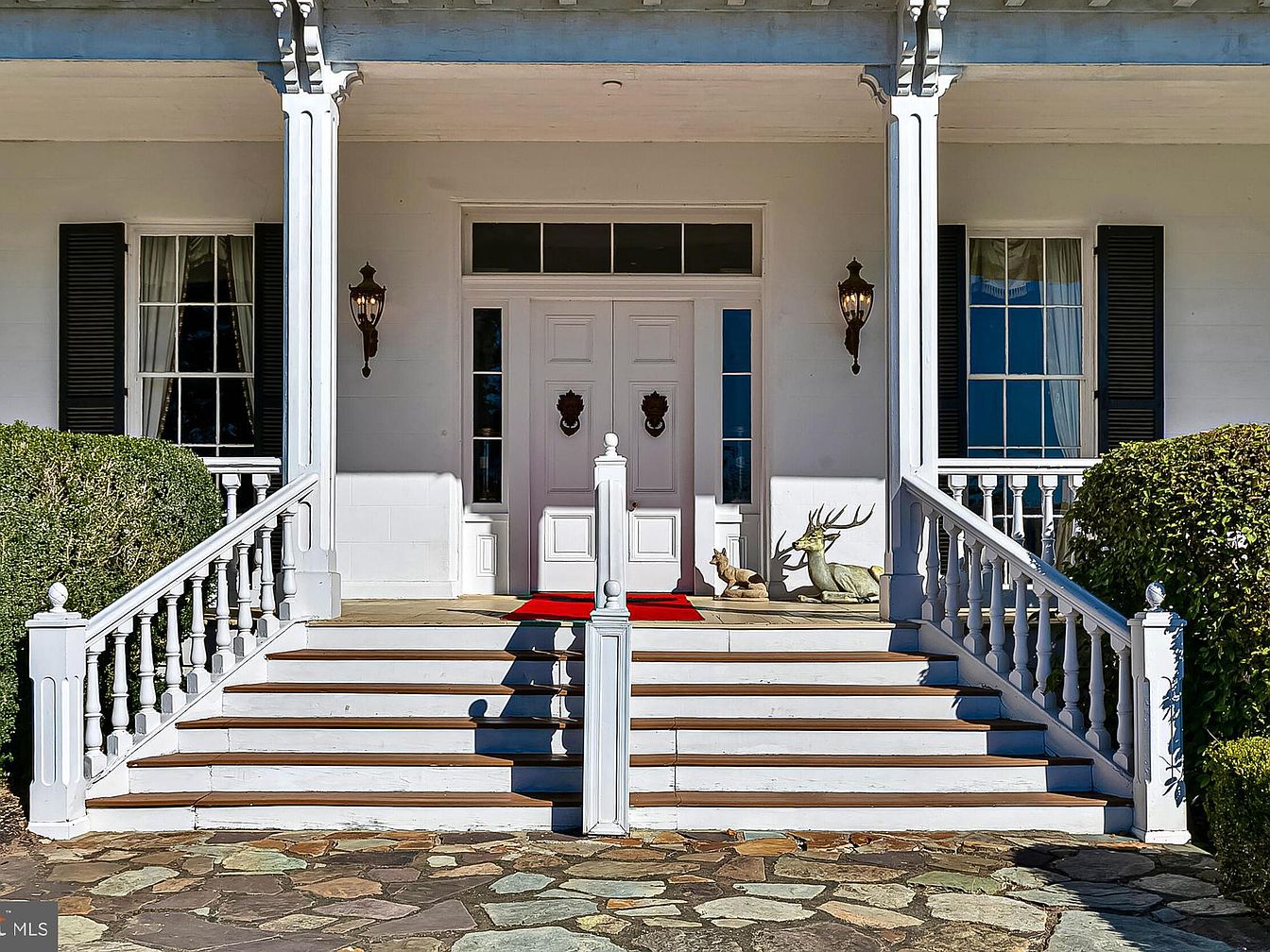 The front entrance showcases a grand, welcoming design with a classic white façade and charming steps leading up to an elegant double door. Flanking the entrance, sizable windows feature black shutters that create a striking contrast against the white walls, while sheer curtains gently filter natural light. The staircase is adorned with white balusters, enhancing the traditional aesthetic. A rich, red runner adds warmth and invites guests. Lush greenery surrounds the entry, providing a family-friendly environment. Notable details include vintage wall sconces that exude character, along with decorative sculptures, making this entrance both inviting and visually appealing.