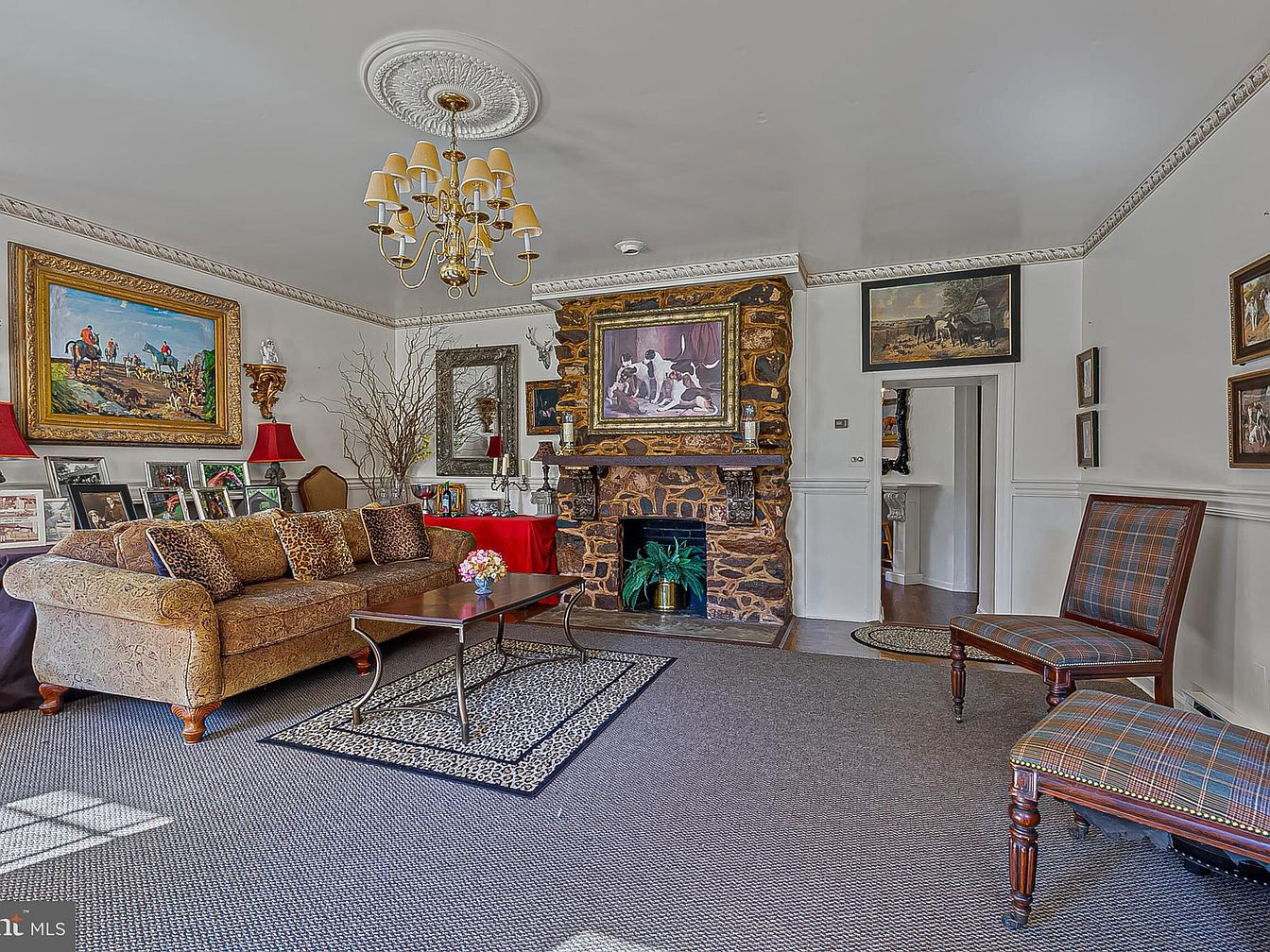 This inviting living room features a blend of vintage charm and modern comfort, highlighted by a plush, ornate sofa adorned with patterned cushions. A warm, stone fireplace serves as the focal point, surrounded by captivating artwork and family photographs on the walls, enhancing the sense of personal history. The space is illuminated by an elegant chandelier, complementing the rich hues of the décor. Two plaid armchairs provide additional seating, ensuring a welcoming atmosphere. The textured carpet and intricate molding add sophistication, making it a perfect spot for family gatherings or quiet evenings, promoting both relaxation and connection.