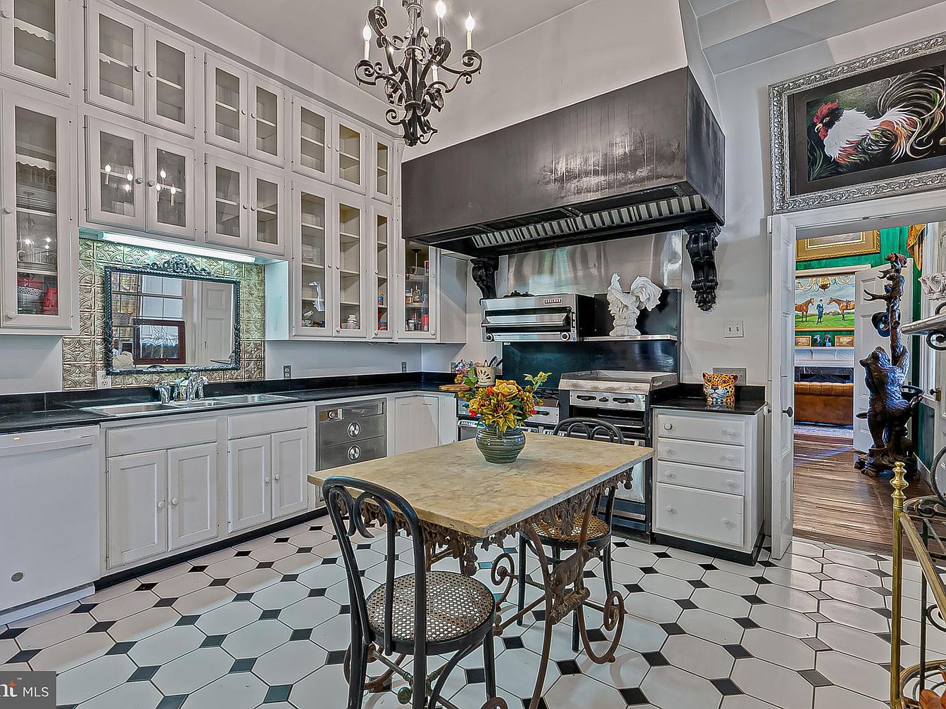 This inviting kitchen boasts a harmonious blend of modern and classic elements. The spacious layout features sleek black countertops paired with white cabinetry, illuminated by natural light. A stunning chandelier hangs above a charming marble-top table surrounded by ornate iron chairs, perfect for family gatherings. The striking hexagonal black and white tile flooring adds visual interest, while the decorative backsplash reflects a creative flair. High-end appliances, including a stylish range and vent hood, cater to culinary enthusiasts. The open design extends towards another room, incorporating vibrant artwork, making it a welcoming hub for family and entertaining.