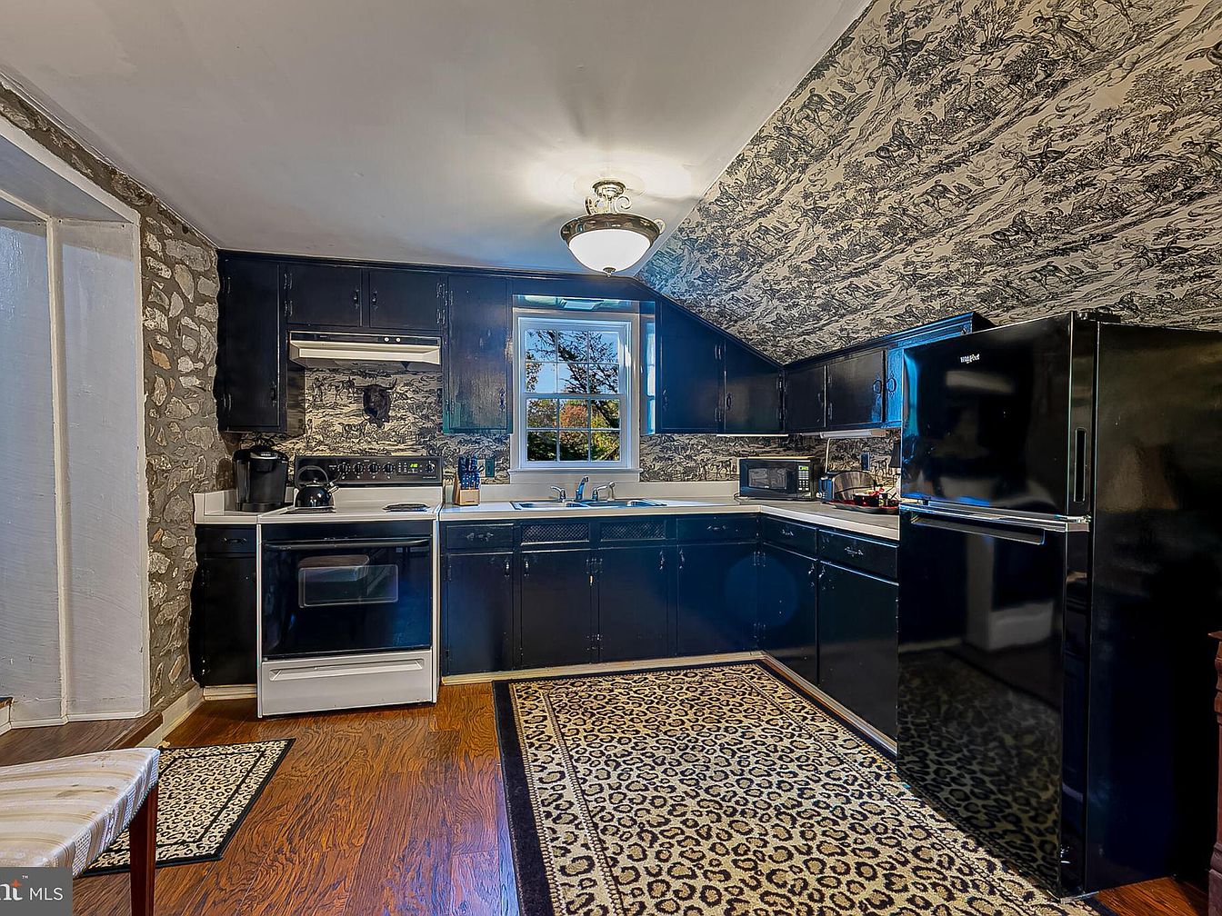 This kitchen features a unique blend of rustic charm and modern convenience. The striking black cabinetry contrasts beautifully with the detailed wallpaper, which showcases a pastoral scene that adds character to the room. Natural light floods through the window, illuminating the black appliances that are perfectly positioned for family cooking. A spacious counter offers ample preparation space, inviting gatherings for casual meals. The warm wood flooring complements the chic leopard-print rug, enhancing the inviting atmosphere. This kitchen is designed for functionality, providing a warm, welcoming hub for family activities and culinary creativity.