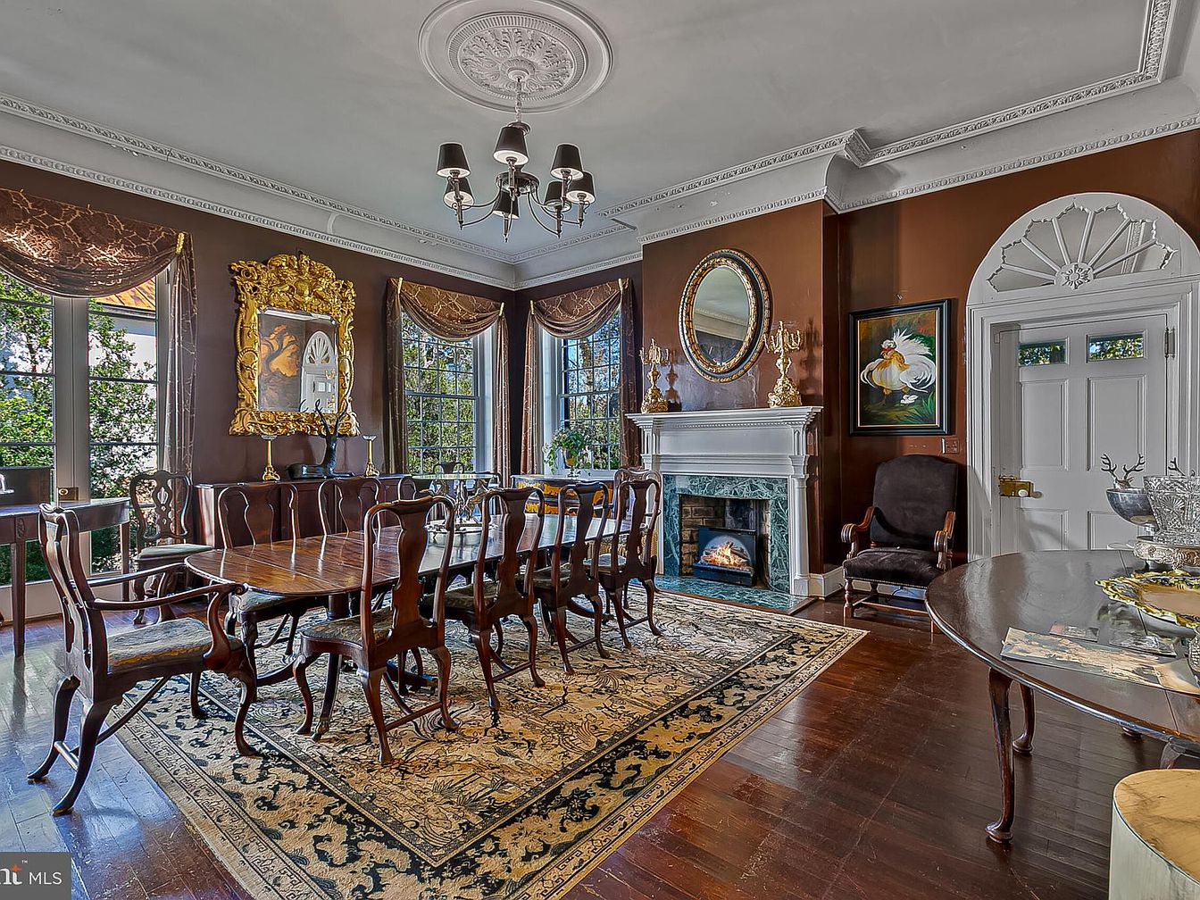 This exquisite dining room features a long wooden table surrounded by intricately designed Chippendale chairs, perfect for family gatherings. Rich, deep brown walls enhance the luxurious feel, complemented by a stunning gold-framed mirror and elegant wall sconces. Large windows allow natural light to stream in, framed by opulent drapes that add warmth to the space. A classic fireplace, with a striking marble surround, serves as a focal point, creating a cozy ambiance. The sophisticated rug anchors the room, while fine artwork provides a touch of personality, making this an ideal setting for both formal dinners and everyday family meals.