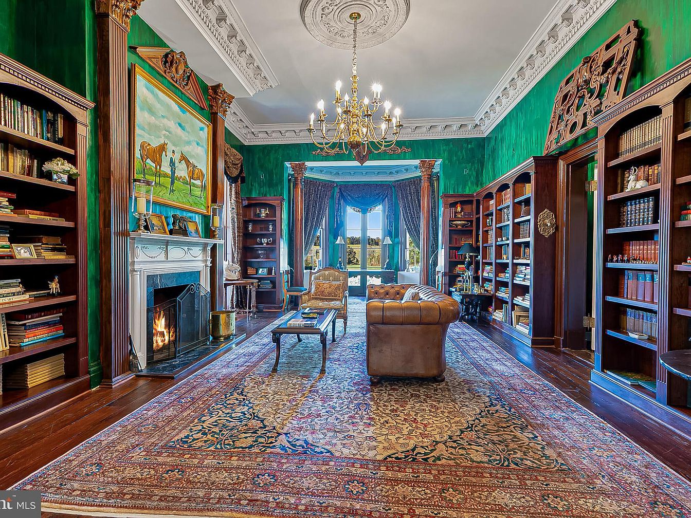 This elegant family room features rich green walls, creating a warm and inviting atmosphere. A stunning chandelier hangs from the ornately detailed ceiling, casting a soft glow over the space. The room is anchored by a plush, tan, tufted leather sofa, which complements the intricate Persian carpet sprawled across the dark hardwood flooring. Built-in bookshelves line the walls, filled with an array of books and decorative items, fostering a cultured feel. A traditional fireplace adds to the cozy ambiance, while large windows invite natural light and offer a picturesque view, making this room ideal for family gatherings.