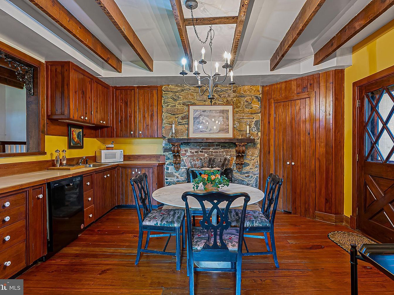 This cozy dining area features warm wooden beams and rich cabinetry, creating a welcoming atmosphere. A round table, adorned with floral decor, invites family gatherings. Natural stone accents complement the rustic charm, highlighted by a fireplace that adds character and warmth. The yellow wall enhances brightness while making the space feel intimate. Comfortable black chairs with artistic upholstery add a personal touch. The layout encourages conversation and connection, with ample cabinetry offering storage for dining essentials. This family-friendly area balances aesthetics and functionality, perfect for mealtime moments and cherished memories.
