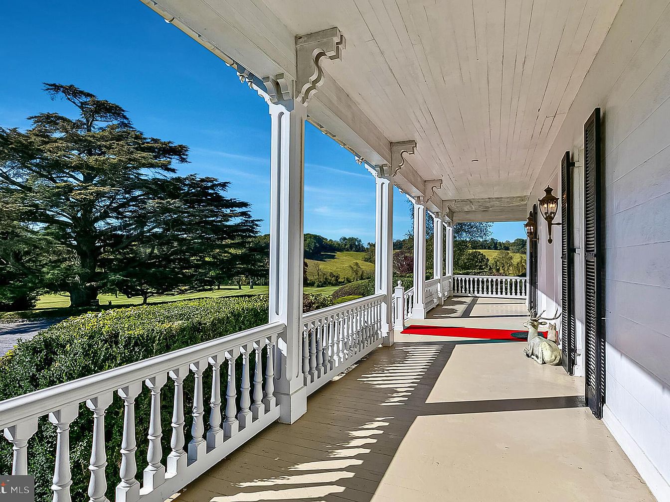 This inviting front porch showcases a spacious layout, bordered by elegant white railings that add a classic touch. The warm, muted tones of the flooring complement the soft blue sky and lush greenery visible beyond. The architectural details include decorative columns and lantern-style sconces, contributing to a welcoming ambiance. A vibrant red runner lays across the floor, enhancing the charm and providing a vibrant contrast to the serene surroundings. Ideal for family gatherings, the area encourages outdoor relaxation, offering a picturesque view of the landscape, perfect for enjoying morning coffee or evening chats.