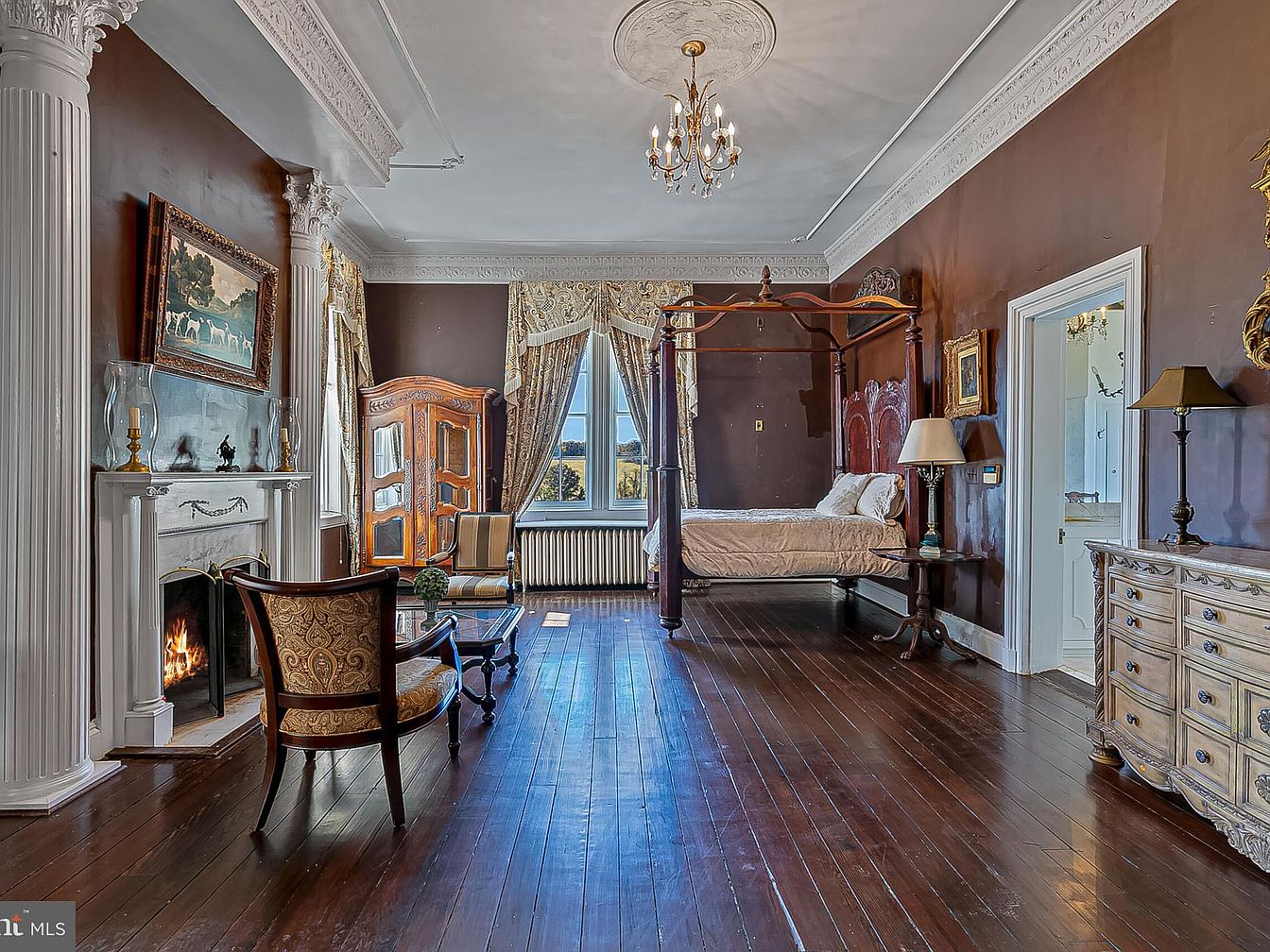 This spacious bedroom features a stunning four-poster bed, adorned with soft, neutral linens, creating a serene atmosphere. Rich, chocolate-colored walls are complemented by elaborate crown molding and an ornate chandelier, casting warm light throughout. A vintage chair with intricate patterns provides a cozy reading spot near the classic fireplace, elegantly framed by white columns. Large windows dressed with luxurious drapes allow natural light to flood the room, while a beautifully carved dresser adds practical storage options. The hardwood flooring enhances the room’s warm and inviting aesthetic, making it an ideal retreat for family relaxation and comfort.