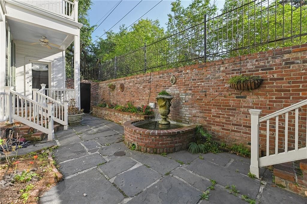 A charming outdoor courtyard features a central brick water fountain that adds a tranquil touch, perfect for family relaxation or children’s play under supervision. Surrounded by a classic red brick privacy wall with decorative planters and wrought iron fencing on top, the space feels both secure and inviting. The stone-paved patio provides ample room for gathering or outdoor dining. White wooden stair railings lead to a covered porch with a ceiling fan for comfort. Soft greenery and potted plants accent the space, and the cheerful atmosphere makes it an ideal spot for family moments and outdoor enjoyment.