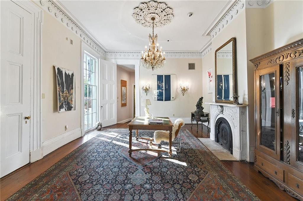 Elegant study room featuring high ceilings adorned with intricate crown molding and a decorative ceiling medallion. A sparkling chandelier hangs in the center, casting warm light across the room. Large French doors on one wall let in abundant natural light and provide a view of the outdoors. A classic wooden desk sits atop a richly patterned area rug, with a plush chair ensuring comfort. The original fireplace with a white marble mantel adds a touch of sophistication, complemented by a large mirror and a stately wooden cabinet. Neutral walls create a calming atmosphere, making the space ideal for family study or quiet reading time.