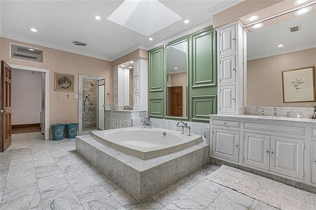 A large, inviting master bathroom features a generous soaking tub set in marble, surrounded by ample floor space for easy movement and family use. Twin vanities with white cabinetry offer plenty of storage and reflect soft recessed lighting from above, creating a serene, well-lit environment. A skylight overhead floods the room with natural light, complementing the pale peach walls. The generous shower area has a glass door and is situated conveniently across from the tub. Soft green panels above the counters add a touch of color and charm, and built-in cabinets ensure elegance and practicality for busy family life.