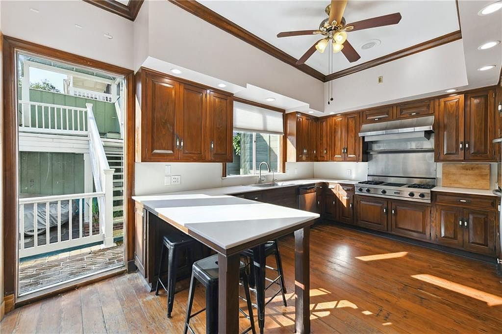 Bright and spacious kitchen featuring rich wooden cabinetry, stainless steel appliances, and a large, professional-grade stove. The countertops are sleek and wrap around the kitchen, providing ample space for family meal prep. A long, central peninsula with bar stools offers an ideal spot for casual dining or homework. The hardwood floors add warmth and complement the cabinetry. Recessed lighting and a ceiling fan create a well-lit, inviting environment. Large windows and a glass door bring in plenty of natural light and provide easy access to the outdoor stairs, making it perfect for gatherings and family activities.