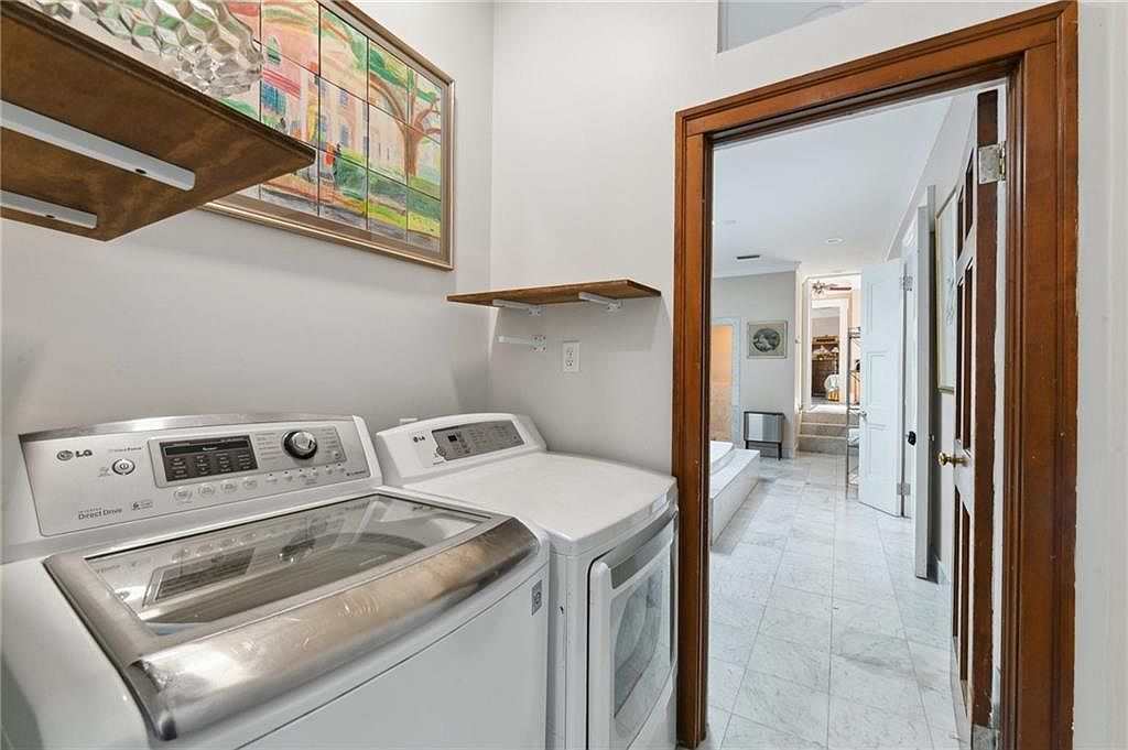 Compact and practical laundry room featuring a modern washer and dryer set with metallic accents, set beneath sleek wooden wall shelves for convenient storage of laundry products and family essentials. The space is brightly lit, with neutral light gray walls and clean white trim, helping maintain a fresh and welcoming atmosphere. A cheerful framed painting adds a splash of color and personality above the appliances. The tile flooring runs seamlessly into the adjacent hallway, making it easy for family members to move between rooms. The adjacent open door provides accessibility and connects directly to the heart of the home.