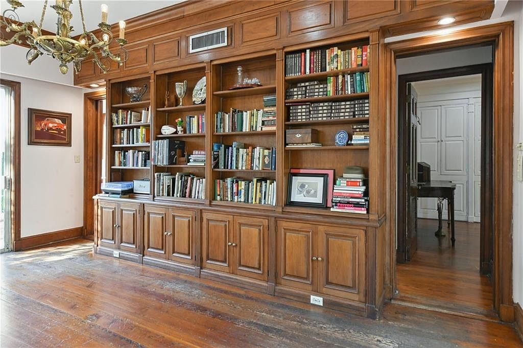 Warm wood tones set an inviting mood in this built-in home library space. Floor-to-ceiling bookshelves showcase family-friendly organization for books, decor, and treasured keepsakes, while lower cabinets offer ample concealed storage for games, crafts, or supplies. The elegant chandelier overhead adds a traditional charm, harmonizing with richly grained, wide-plank hardwood flooring. Natural light streams through a glass door, enhancing the room’s sense of openness, ideal for reading or family bonding. Doorways connect the library seamlessly to adjacent living areas, facilitating easy supervision of children and conversation flow. Neutral wall colors make this versatile space blend beautifully with any style.