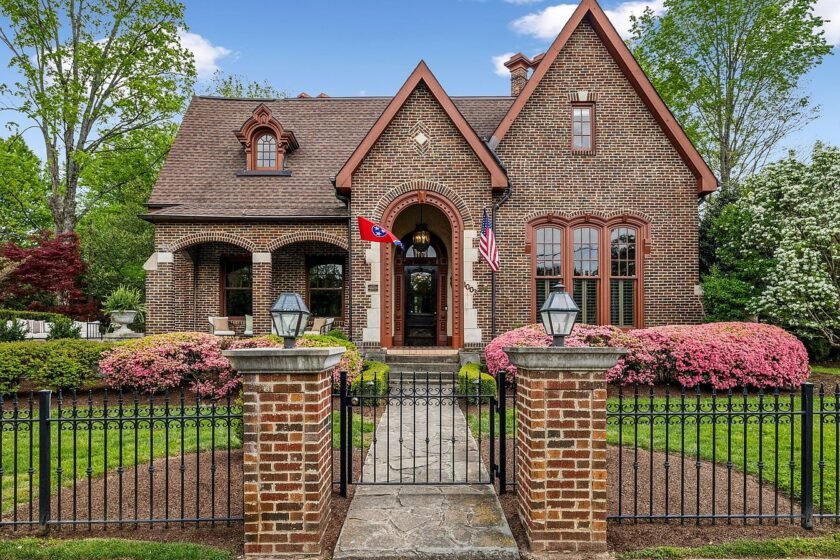 Red brick walls combined with intricate brickwork frame the arched windows and entryway, presenting a charming, classic aesthetic. The steeply pitched roof is covered with brown shingles, adorned with decorative gables and a distinctive arched dormer window. Light stone accents highlight architectural details, contrasting with the red-brown tones. A front porch with arched brick columns adds Tudor Revival style character. Manicured shrubs and flowering bushes well complement the green lawn. A black wrought-iron fence with ornamental spearhead tops borders the property, enhancing the historic and refined curb appeal under a clear blue sky.
