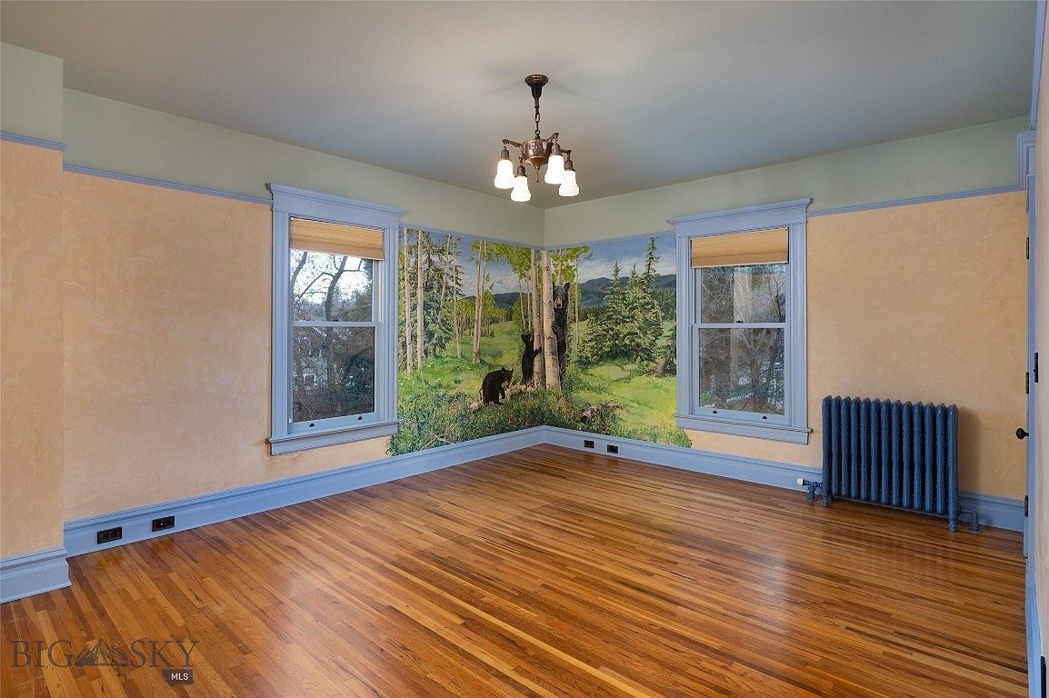 This cozy corner bedroom features honey-toned hardwood floors and soft, buttery yellow walls accented with light blue trim. Natural light floods in through two large windows, fitted with simple beige shades, creating a bright atmosphere perfect for a family. The focal point of the space is a whimsical wall mural between the windows, depicting a lush forest scene with playful black bears, adding a child-friendly and imaginative touch. The room’s classic radiator provides efficient heat, while the central light fixture with five bulbs ensures the space is well-lit. The open layout offers flexibility for various furniture arrangements.