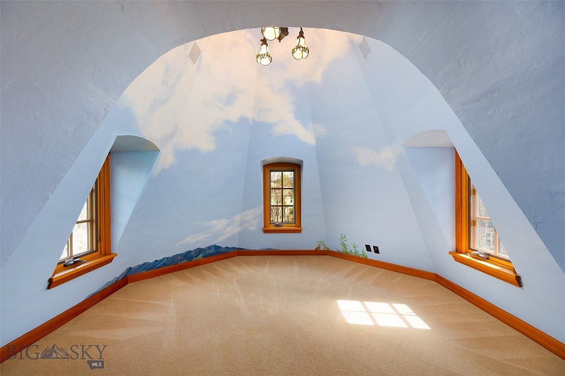 This charming alcove bedroom features soft sky blue walls with hand-painted murals of light clouds and distant mountains, creating a soothing, imaginative environment perfect for children or family relaxation. Three arched windows framed in warm honey-colored wood provide ample natural light and scenic outdoor views, making the space bright and welcoming. The cozy carpeted floor ensures a comfortable, safe play area for young children. Unique architectural angles add character and maximize usable room, while an elegant vintage-style chandelier adds a touch of whimsy. This peaceful space combines practical family functionality with artistic details for a serene retreat.