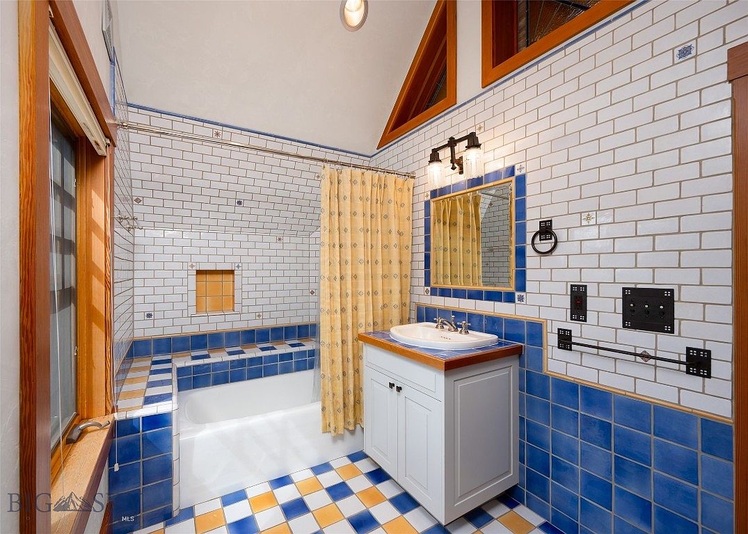 This bright, inviting family bathroom features a playful mix of blue, white, and yellow tiling on the floors and around the tub area, infusing the space with cheerful energy. Large white subway tiles line the walls, accented by deep blue and occasional yellow patterned tiles, giving the room a cohesive and easy-to-clean appearance. A spacious tub with a built-in shelf and sturdy, colorful tiled edge is perfect for bath time with children. The single-sink white vanity provides practical storage, while a large mirror with double lights creates a welcoming ambiance. Oversized windows offer natural light, enhancing the family-friendly atmosphere.