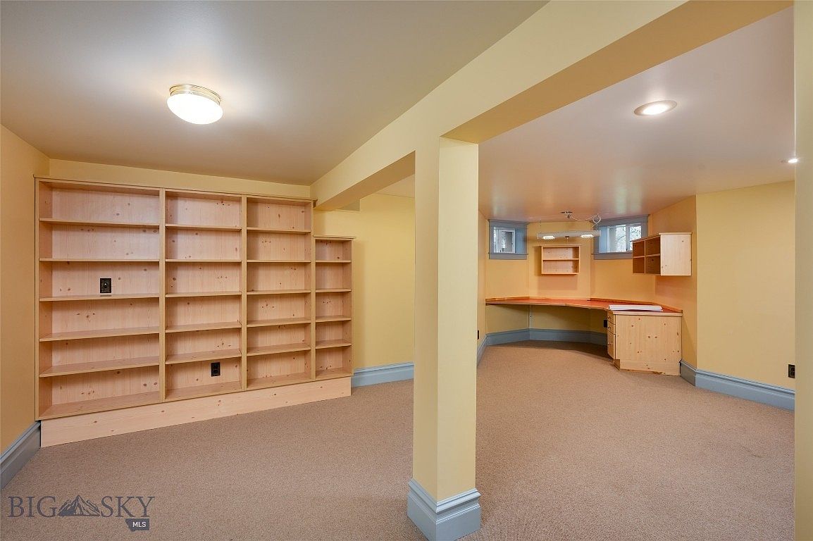 A spacious, multi-purpose room designed for productivity and comfort, ideal for a family study or home office. The area features built-in light wood bookshelves spanning one wall for ample storage, paired with a large, L-shaped wooden desk in a cozy alcove, suitable for homework or remote work. The walls are painted a soft yellow, bringing warmth and a welcoming feel, while neutral beige carpeting offers a soft surface for children to play. Several windows near the ceiling provide natural light, and recessed plus ceiling lights ensure bright, even illumination, making this space inviting, organized, and family-friendly.