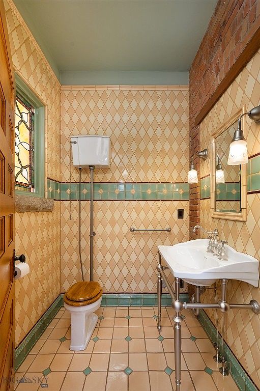 A charming, vintage-inspired bathroom featuring warm beige and green diamond-patterned wall tiles and a matching tiled floor accented with delicate green squares. An exposed red brick accent wall adds character and texture. The high-tank toilet with a wooden seat offers a classic touch, positioned beside a wide basin sink set on metallic legs. Above the sink, a square mirror is lit by two wall-mounted sconces with frosted glass shades, providing a soft, inviting light. The large window features stained glass, filling the room with natural light and color. A sturdy grab bar enhances safety, making the space family friendly for all ages.