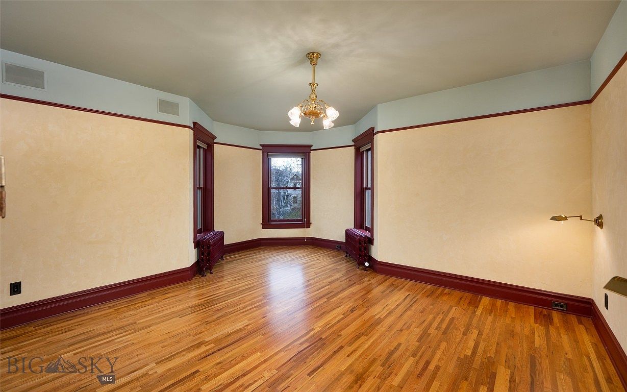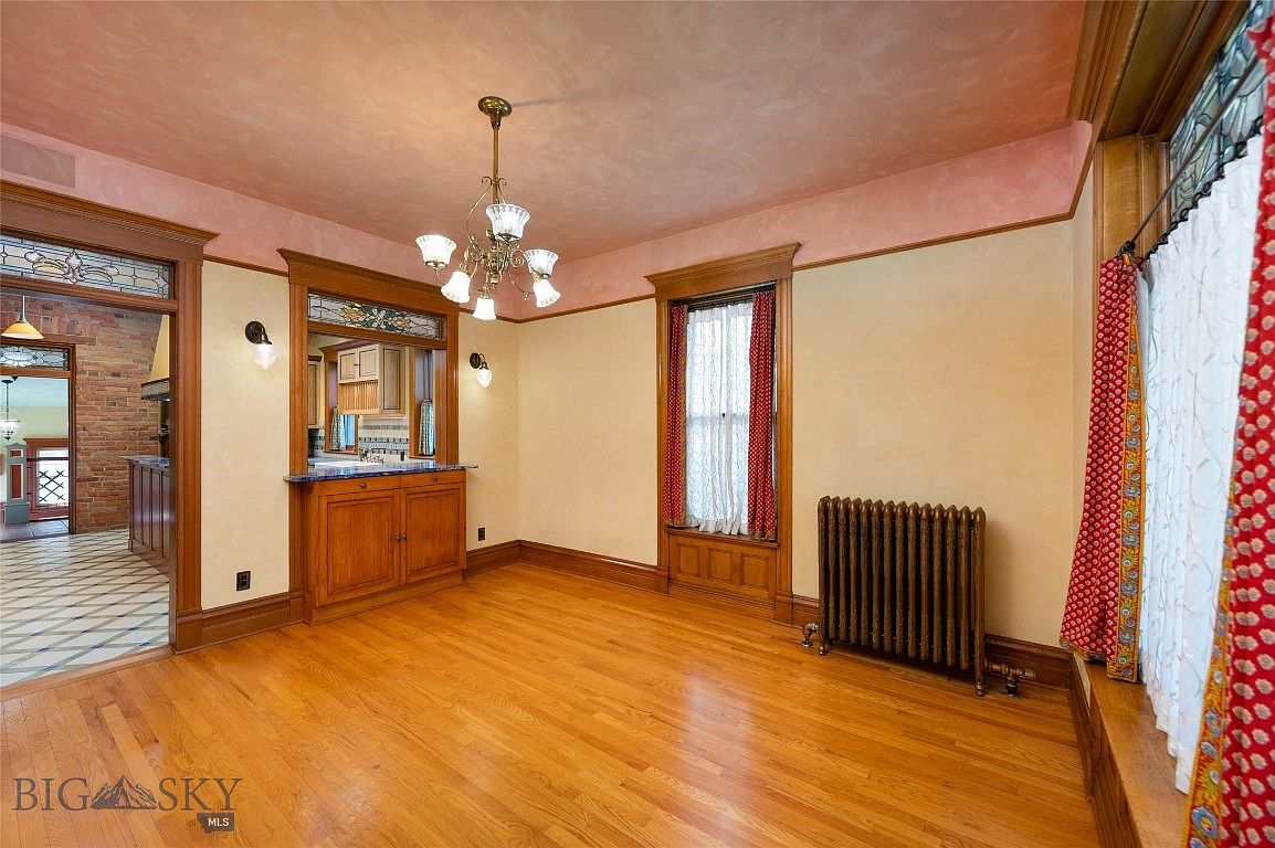 This elegant dining room features finely polished hardwood floors and warm, honey-toned wood trim that frames the doorways and windows, creating a welcoming and family-friendly space. Large windows, dressed with lace curtains and vibrant red drapes with golden patterns, allow natural light to filter in, enhancing a sense of openness and comfort. The soft peach-colored walls and ceiling add gentle warmth to the atmosphere. A classic chandelier hangs overhead, providing a central focal point. Vintage details, such as the ornate radiator and built-in wooden buffet, offer both charm and practical storage, perfect for gatherings and creating lasting family memories.