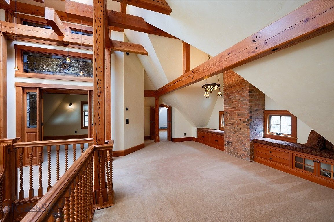 A spacious upstairs landing combines open living with architectural charm, making it ideal for families seeking both style and functionality. Natural wood beams and railings accentuate the vaulted ceilings, while warm beige walls and plush carpeting give a cozy, inviting feel. Built-in wooden benches beneath the windows offer practical seating or reading nooks for children and adults. The stained-glass panels above the stairwell add an elegant touch. A beautiful brick chimney creates a focal point and subtle room division. Large windows and glass doors flood the area with natural light, perfect for play, gathering, or a peaceful retreat within the home.