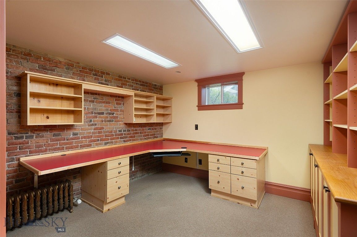 A spacious home office featuring a large L-shaped built-in desk with natural wood cabinetry and red countertops, offering plenty of workspace for multiple family members. Open shelves above the desk provide storage for books, supplies, or decor. The exposed brick accent wall adds warmth and industrial charm to the room, while the beige walls and trim in a muted red match the desk surfaces for a cohesive look. Ample overhead fluorescent lighting ensures the room stays bright and practical for daytime and evening use. This flexible space is ideal for family projects, remote work, or a dedicated homework area for children.