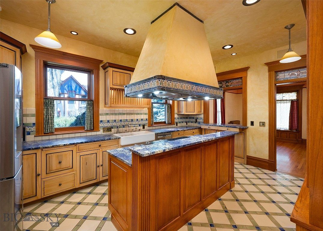 Bright and spacious kitchen featuring a large central island with rich blue granite countertops, perfect for meal prep or casual family gatherings. The cabinetry is crafted from light wood with clean lines, complementing the warm beige walls and coordinated tile backsplash in calming blue and cream tones. The farmhouse sink sits beneath two wide windows that let in abundant natural light, offering pleasant outdoor views. Recessed lighting and pendant fixtures provide ample illumination. The patterned tile floor is easy to clean and child-friendly, while an expansive range hood adds a touch of classic elegance, making it ideal for busy family living.