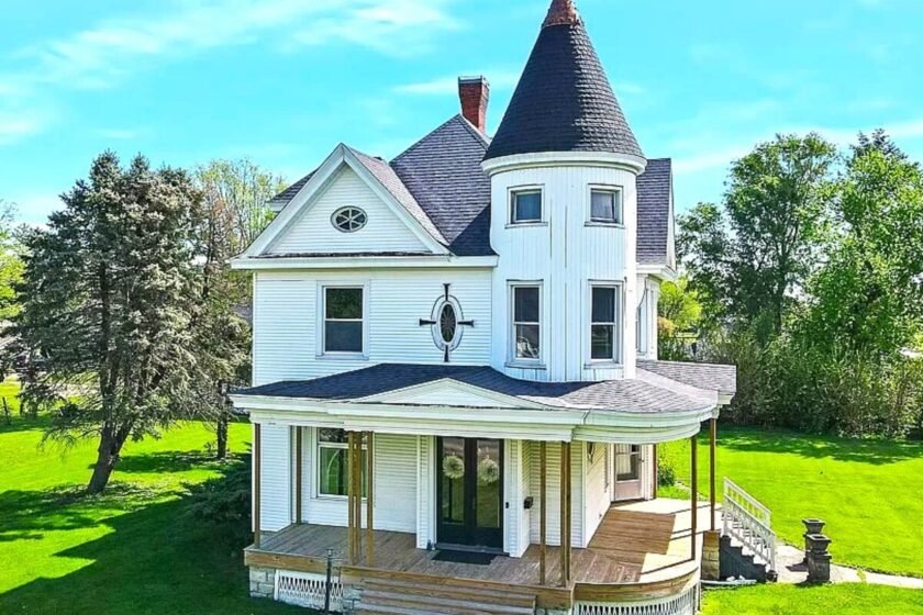 The round turret is a standout feature, adding to the home’s majestic appearance.