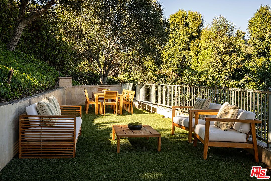 A spacious outdoor patio set against lush green landscaping, featuring comfortable wooden lounge chairs and sofas with plush cream cushions and striped accent pillows. The seating encircles a simple wooden coffee table, ideal for family gatherings or relaxed conversations. At the far end, a six-seat wooden dining table provides space for outdoor meals, all resting on a clean, grassy surface. The area is bordered by a secure metal railing, making it safe for children. Natural shade is offered by mature trees, and the overall design emphasizes a welcoming, family-friendly atmosphere with harmonious tones of green, tan, and natural wood.