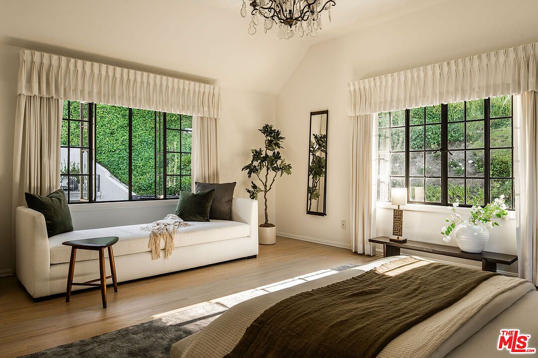 Bright and welcoming, this spacious primary bedroom features tall ceilings and large black-framed windows that let in ample natural light, creating an airy atmosphere. The neutral color palette of cream and beige is complemented by dark wood accents, including two sturdy nightstands and a sleek bench beneath one window. Soft carpeting covers the floor, adding comfort and warmth, while thick curtains and valances provide privacy for families. The plush upholstered bed, layered with textured linens and multiple pillows, invites relaxation. Modern table lamps, fresh greenery, and minimalist artwork combine for a serene, family-friendly retreat well-suited for restful nights and cozy mornings.