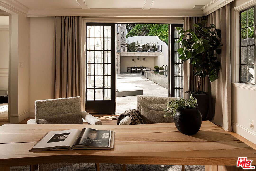 A spacious, well-lit room opens through elegant French doors onto a welcoming patio, creating a seamless indoor-outdoor living space ideal for families. The room features a large wooden table with two plush, textured armchairs, perfect for gatherings or homework sessions. Soft beige curtains frame the tall windows, filling the room with natural light, while a healthy potted plant adds a refreshing green touch. The walls and ceiling are finished in light neutral tones, complemented by rich wood accents and tasteful decor. Outside, the patio offers a safe open area for children to play or for family meals and entertaining guests.