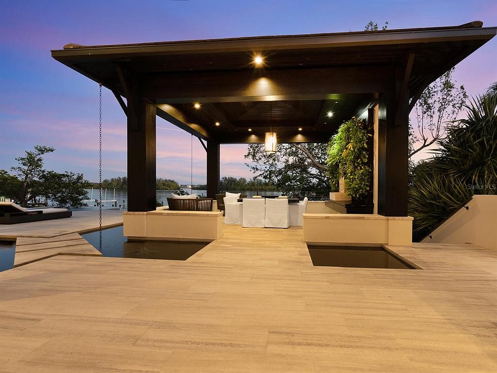 A spacious covered patio overlooks a tranquil waterfront, ideal for family gatherings and entertaining. The area features a contemporary open-air design with dark wooden beams supporting a stylish roof, recessed lighting, and a large rectangular dining table surrounded by white slipcovered chairs. Neutral stone flooring creates a clean and modern look, while lush greenery accents one wall for a touch of nature. The setting offers both shaded comfort and openness, perfect for children to play safely while adults relax. Water features nearby enhance the serene, resort-like ambiance, making this an inviting place for both relaxation and family meals.