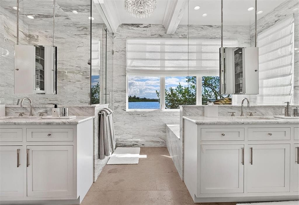 Spacious bathroom featuring dual vanities with white cabinetry and sleek marble countertops, perfect for busy family routines. Large wall-mounted mirrors hang above each sink, paired with modern chrome fixtures. The room is bright and airy, with natural light streaming through expansive windows adorned with sheer white roman shades, offering a tranquil view of a lake and trees. Subtle gray veining on the marble walls and countertops adds elegance, while soft towels and plush bath mats provide comfort. The layout encourages privacy and functionality, ideal for families needing extra space and easy morning preparations. Crystal lighting overhead adds a touch of luxury.