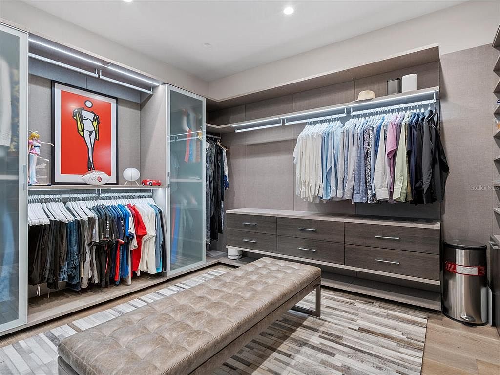 Spacious and meticulously organized walk-in closet featuring ample hanging space for clothing, sleek built-in drawers, and frosted glass cabinet doors, making it both functional and stylish for family living. The contemporary color palette uses gray wood cabinetry, soft neutral wall tones, and a striped area rug that adds warmth and comfort underfoot. An upholstered tufted bench in the center provides both seating and convenience, perfect for dressing or storing laundry baskets. Overhead recessed lighting offers bright illumination, enhancing visibility. Decorative touches like modern art and collectibles on the shelving add personality, making this closet welcoming and practical for busy family routines.