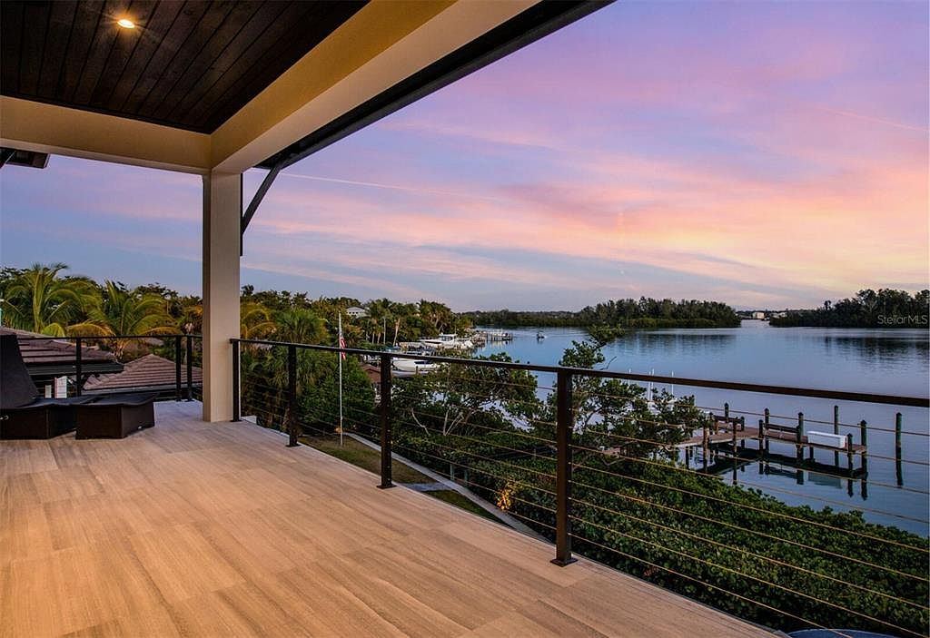 Spacious covered balcony overlooks a serene waterside landscape, perfect for family relaxation or entertaining. The balcony features light wood-look tile flooring, sleek black railings, and a dark wood paneled ceiling with recessed lighting, creating a modern yet inviting outdoor living area. Comfortable lounge seating is positioned in one corner, offering a place for parents to unwind while children play safely within the enclosed space. The open layout maximizes views of the calm river, lush greenery, and distant docks, while the sturdy railing ensures safety for kids and pets. The gentle pastel hues of the sunset add to the peaceful family ambiance.