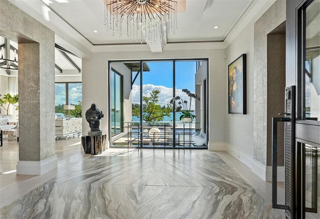 A spacious and elegant entryway greets visitors with natural light pouring in from floor-to-ceiling glass doors, offering a stunning vista of the lake and blue sky beyond. The entryway features beautiful marble-look tile flooring in gentle gray and cream tones, harmonizing with the neutral wall colors. An eye-catching modern chandelier hangs overhead, adding a touch of luxury. Stylish décor includes a sculptural statue on a rustic wood pedestal and framed art on the wall. This open, uncluttered area hints at the family-friendly spaces beyond, inviting gatherings and peaceful moments, while the secure, glass-enclosed patio is ideal for family enjoyment.