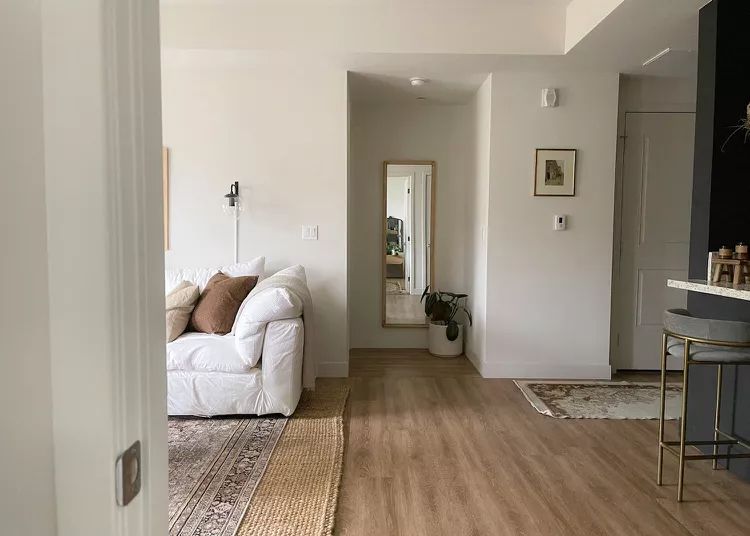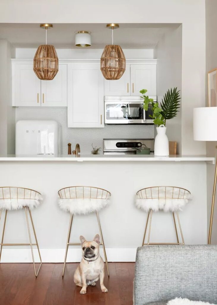 Infuse a bit of luxury into your apartment by adding metallic accents. In this modern apartment, warm tones of rose gold are used throughout—from the lighting fixtures to kitchen hardware—bringing a cohesive, upscale feel to the space. These small metallic elements create visual interest and a sense of opulence, all while maintaining a minimalist white palette. Adding metallic finishes can subtly elevate a room, making it feel more refined and expensive without overwhelming the design.