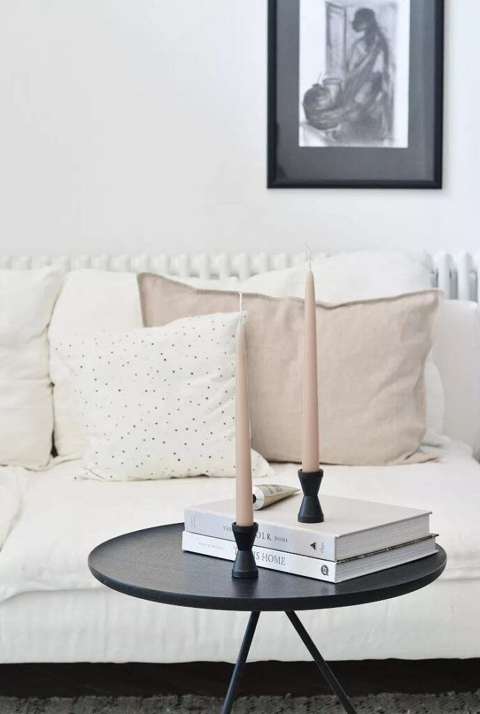 Add a personal touch to your minimalist living room with DIY candle holders. Simple materials like terracotta pots, acrylic paint, and glue can easily transform into chic, custom candle holders. These budget-friendly creations not only serve as a practical lighting solution but also introduce a soft, ambient glow that enhances the room’s overall vibe. Just like in this space, incorporating a unique, handmade detail can elevate the aesthetic of your coffee table or any surface you choose to style.